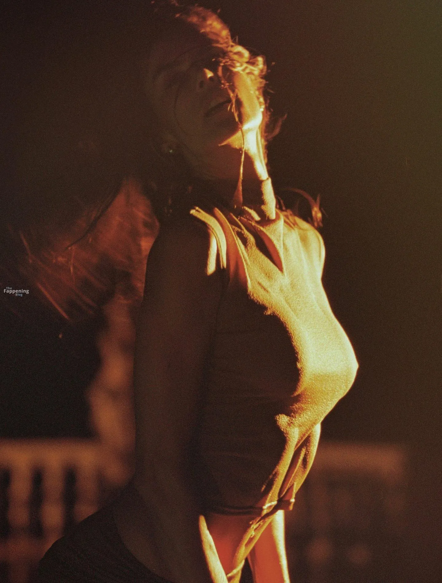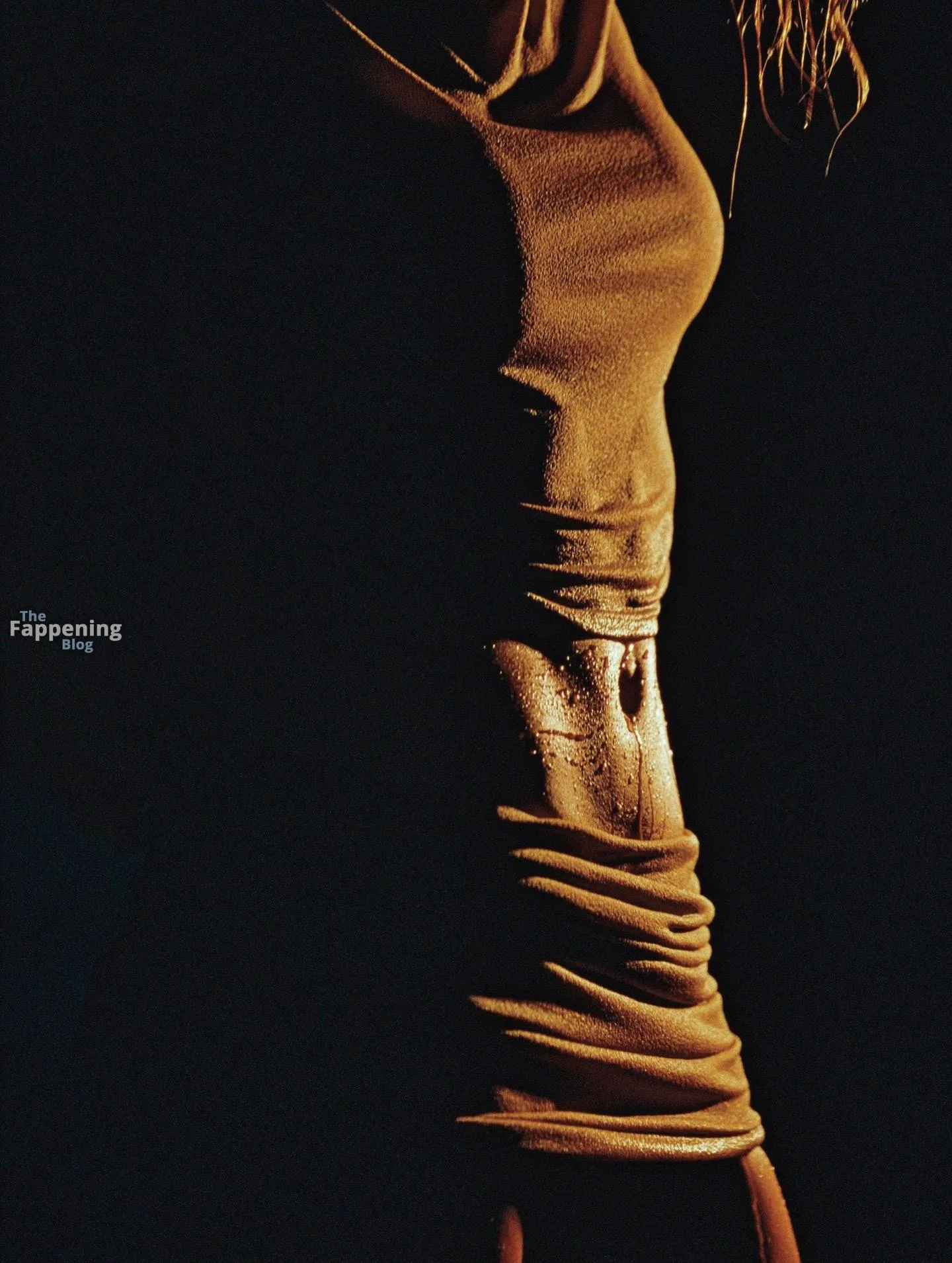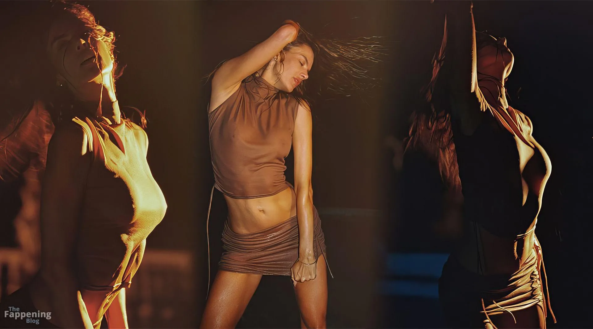 Alessandra Ambrosio poses in a sheer bronze dress, showing off her wet tits.