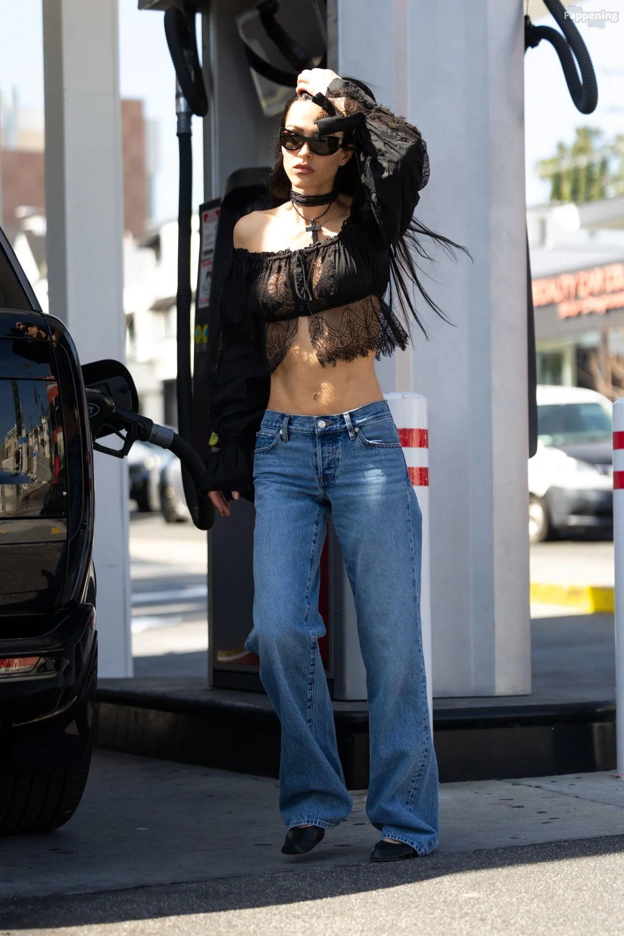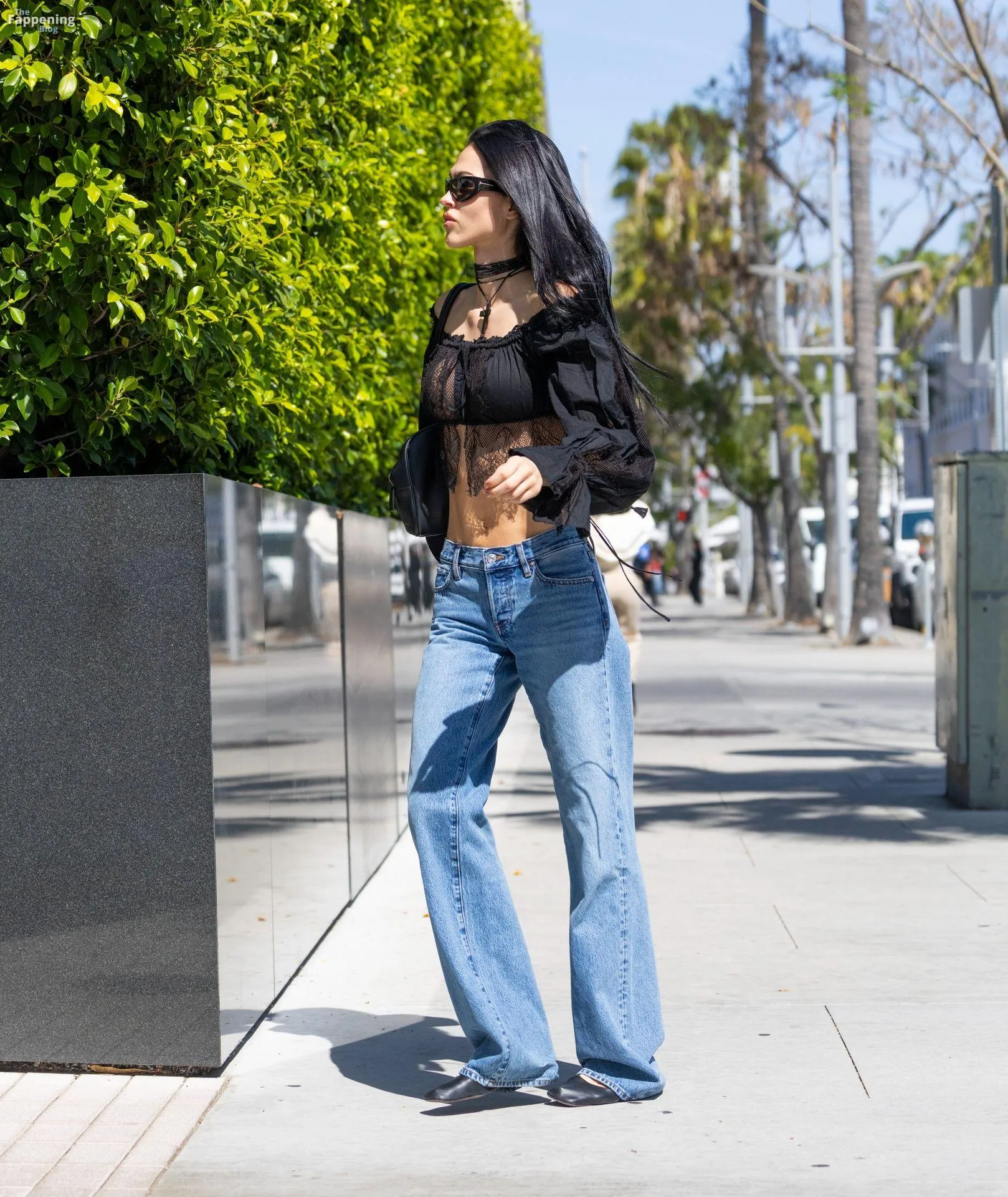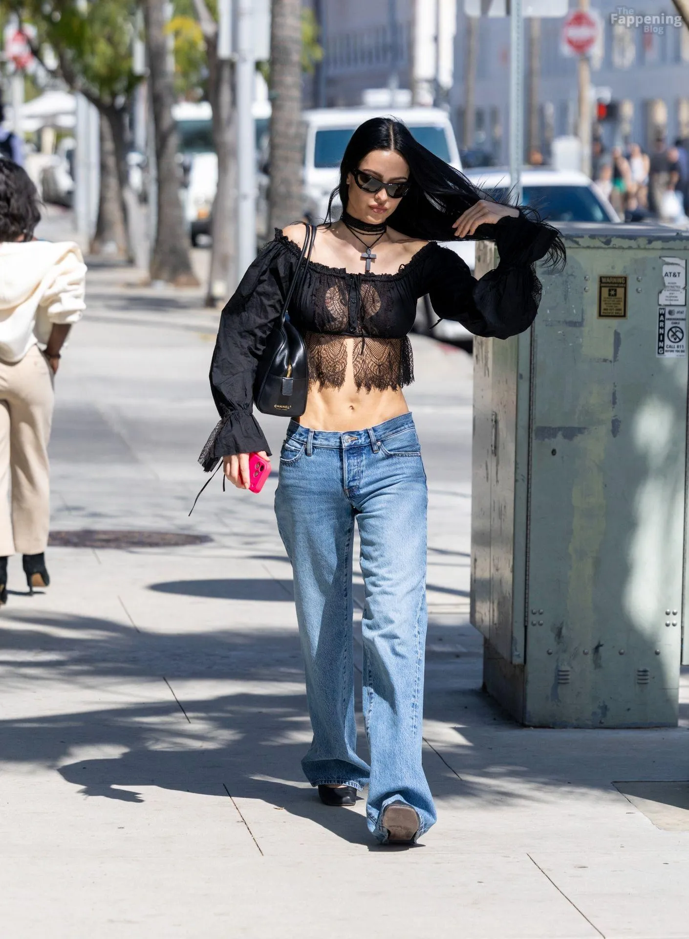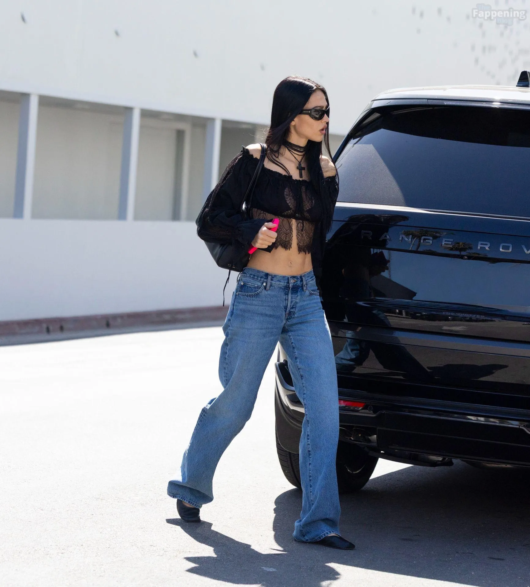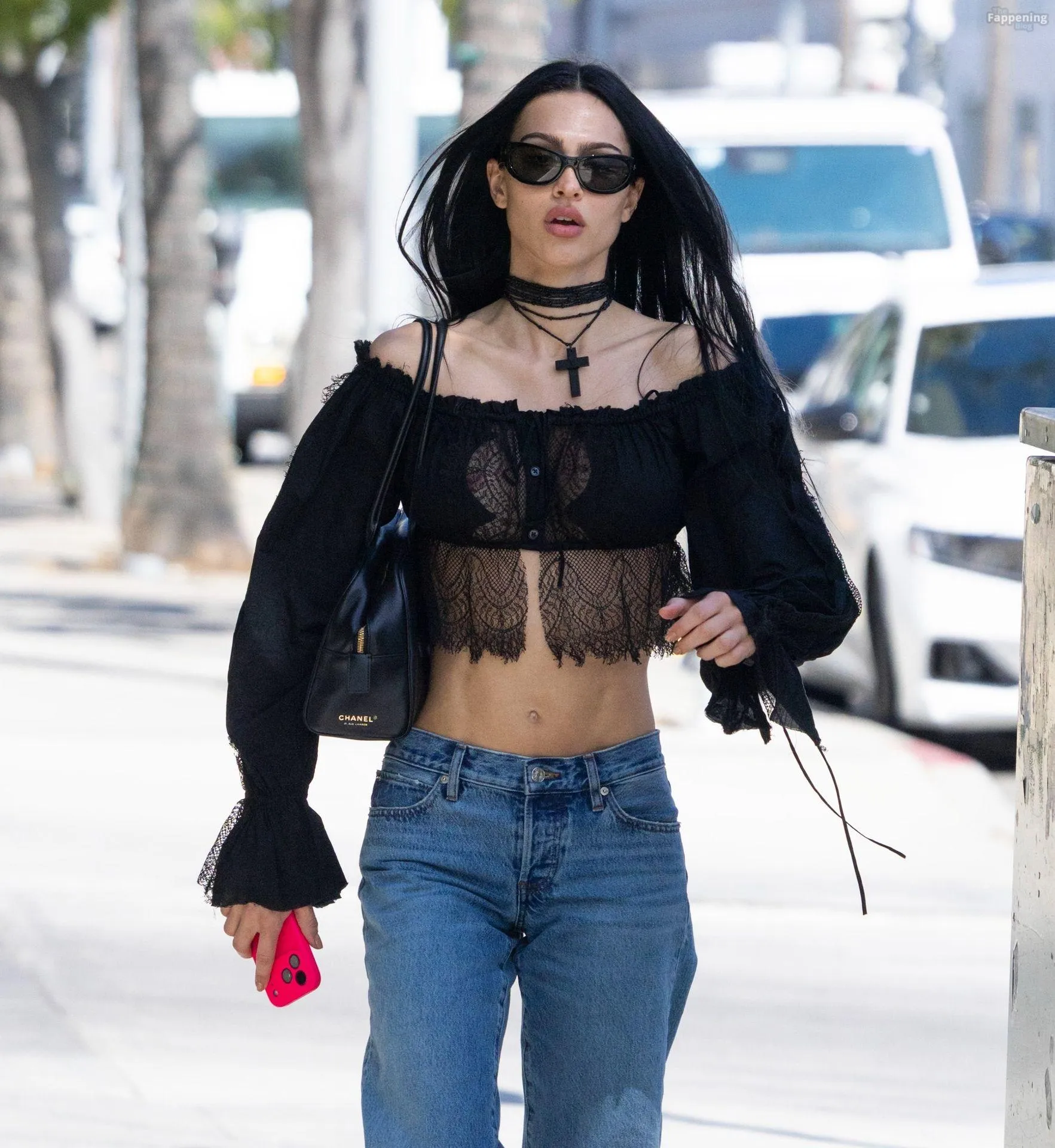 Amelia Gray Hamlin stepped out in a sheer lace top, flashing her tits and midriff and pairing it with low-slung denim and a striking cross necklace.