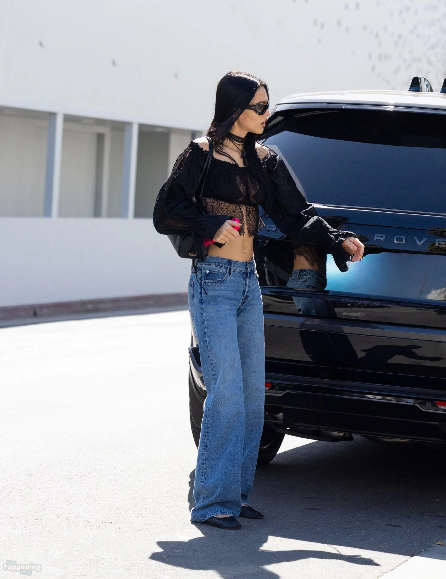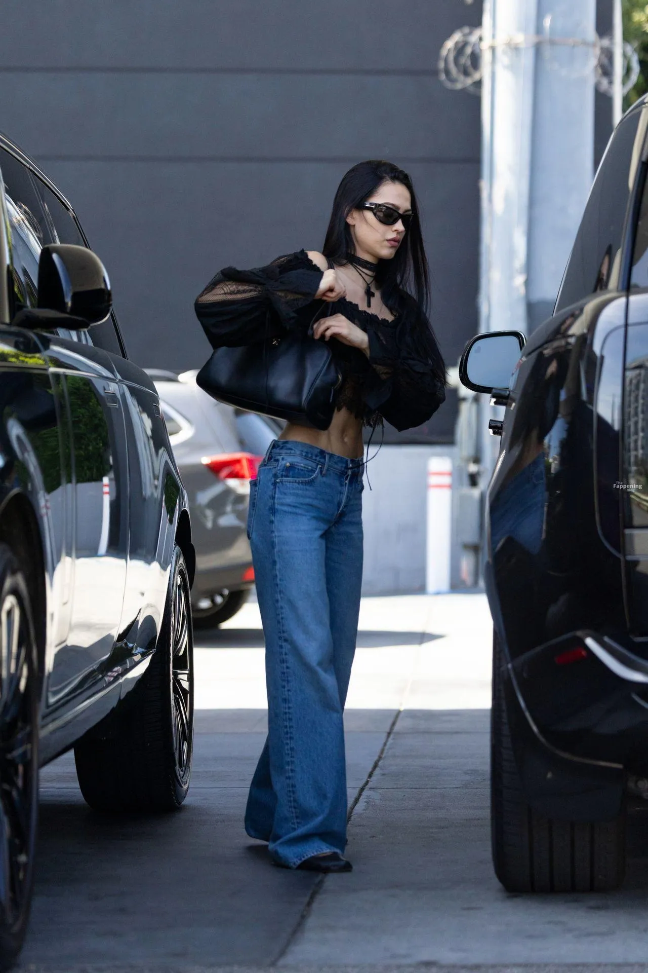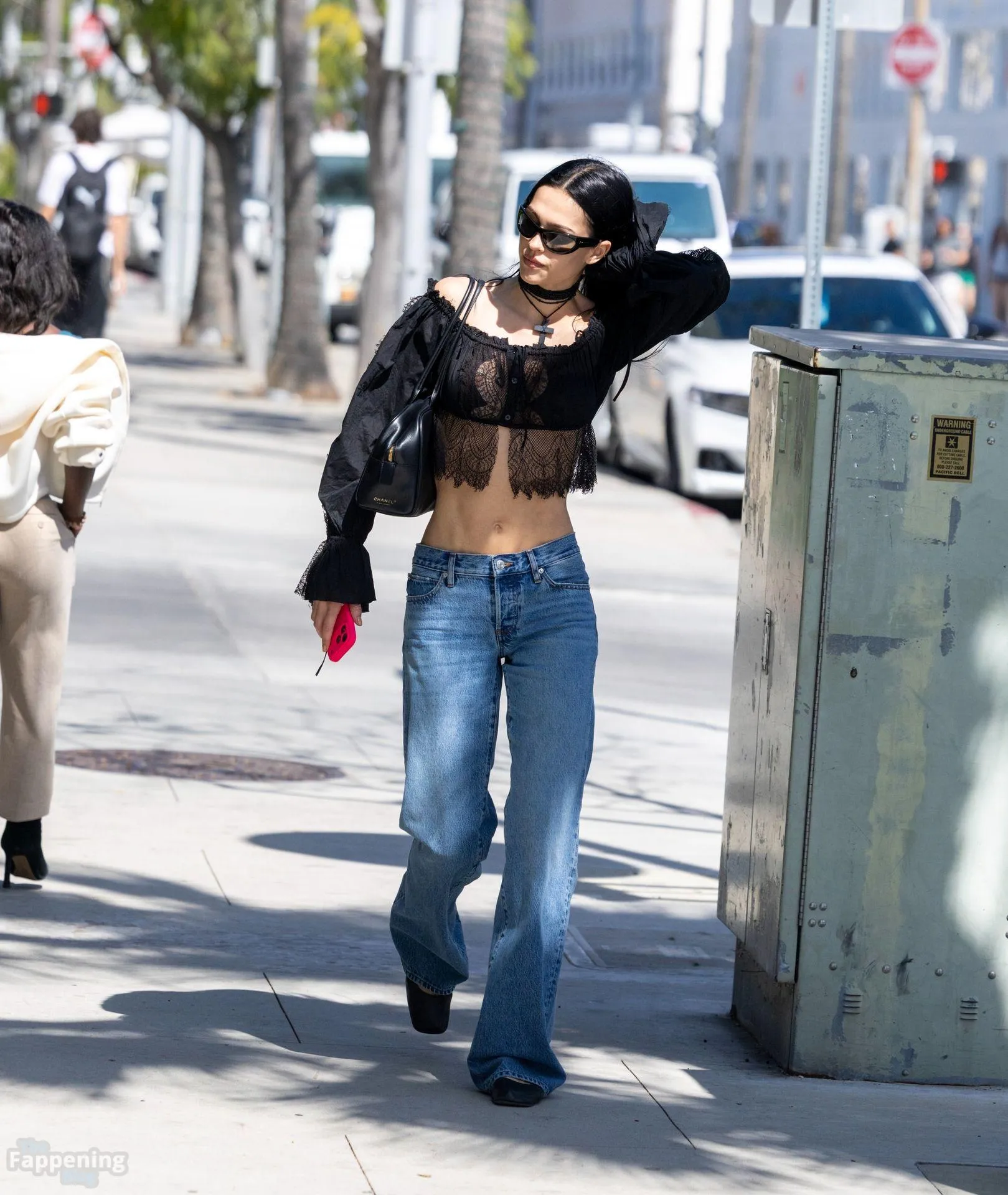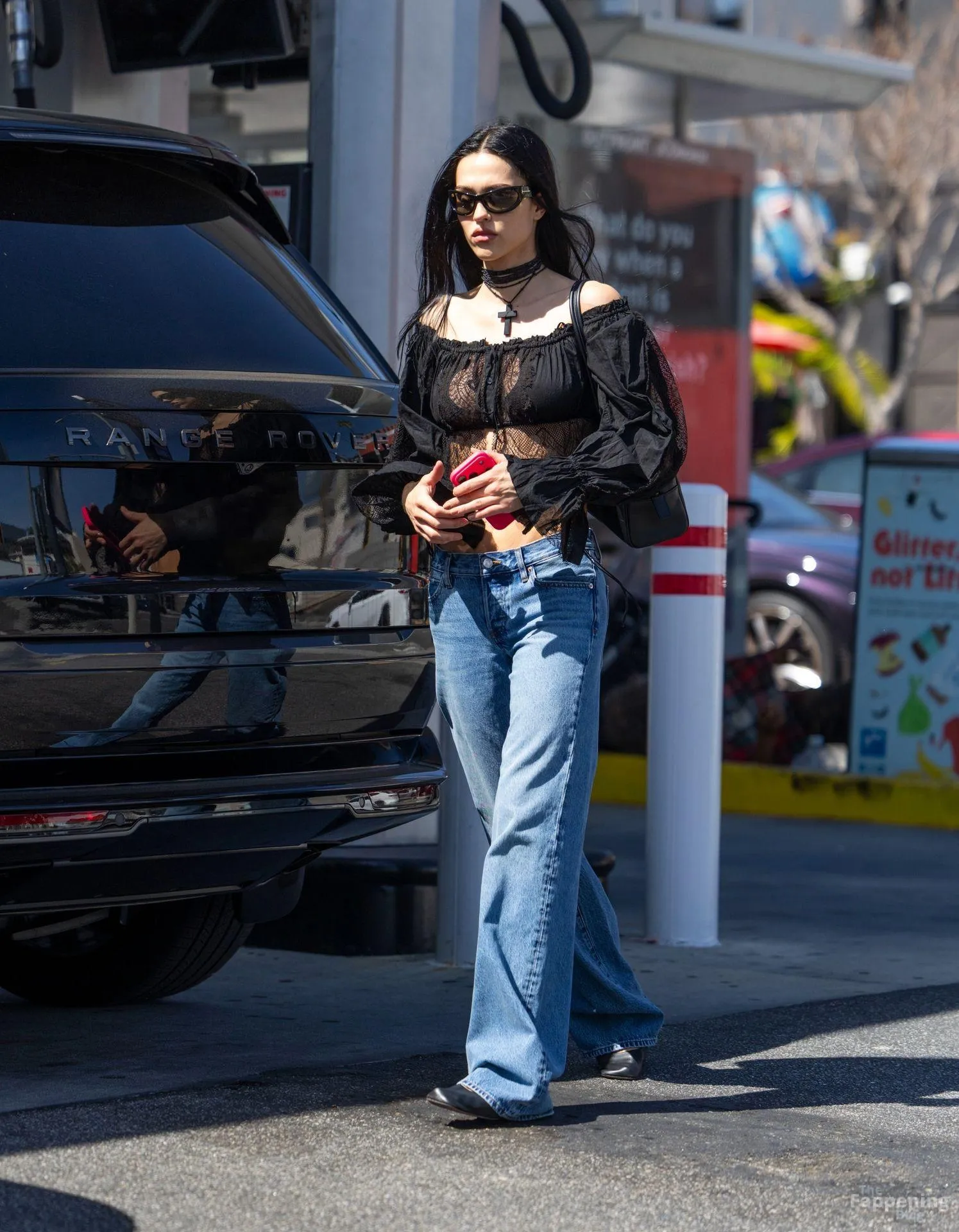 Amelia Gray Hamlin stepped out in a sheer lace top, flashing her tits and midriff and pairing it with low-slung denim and a striking cross necklace.