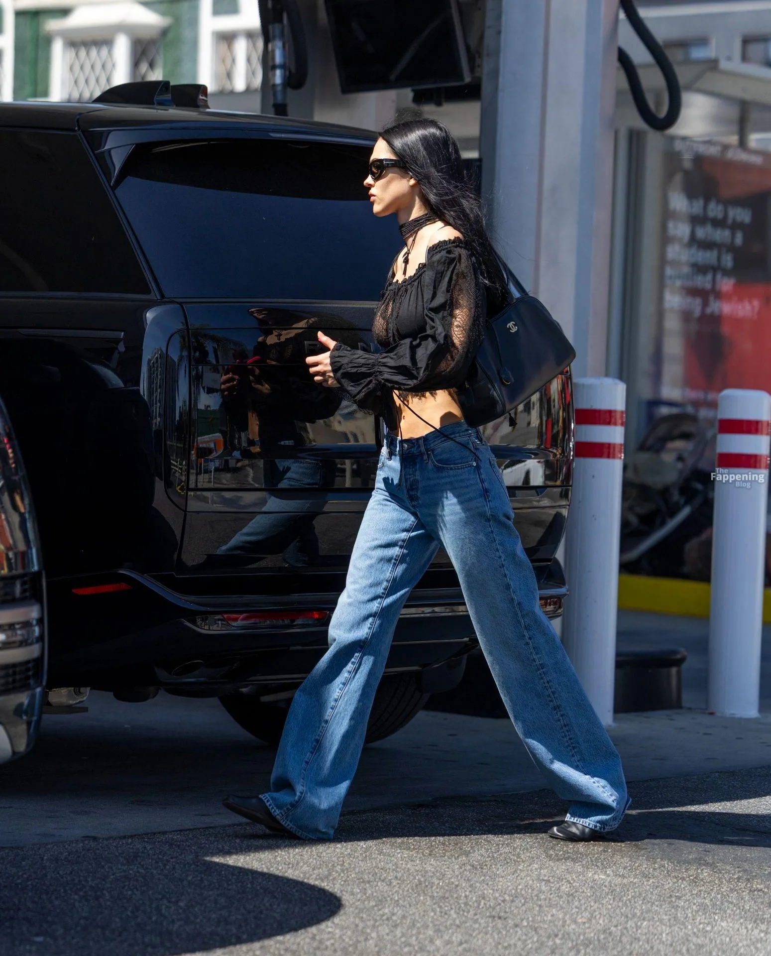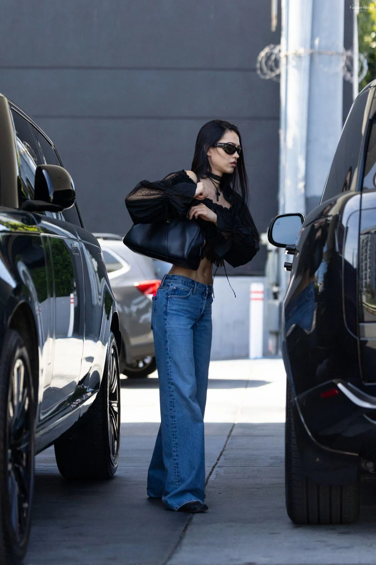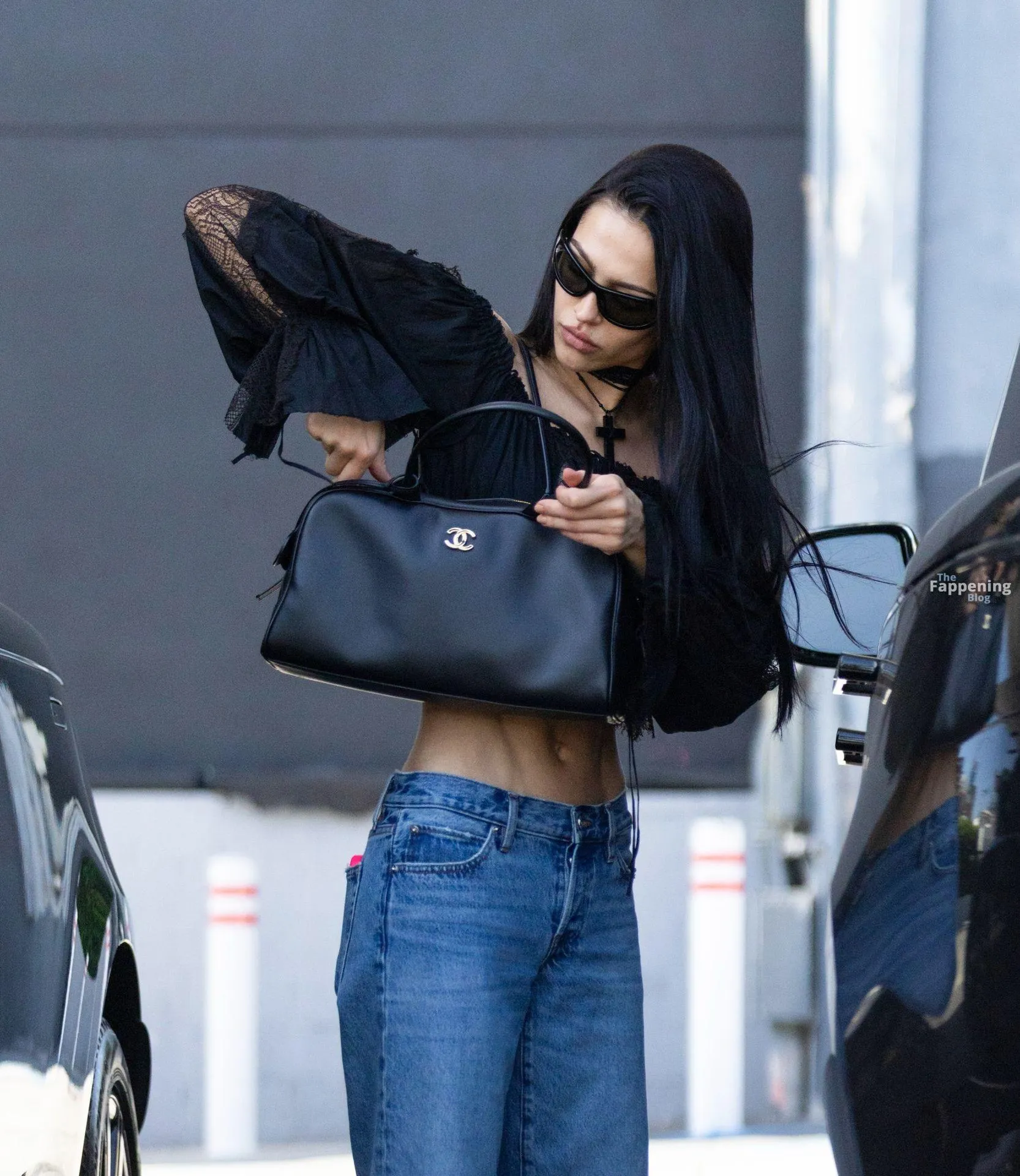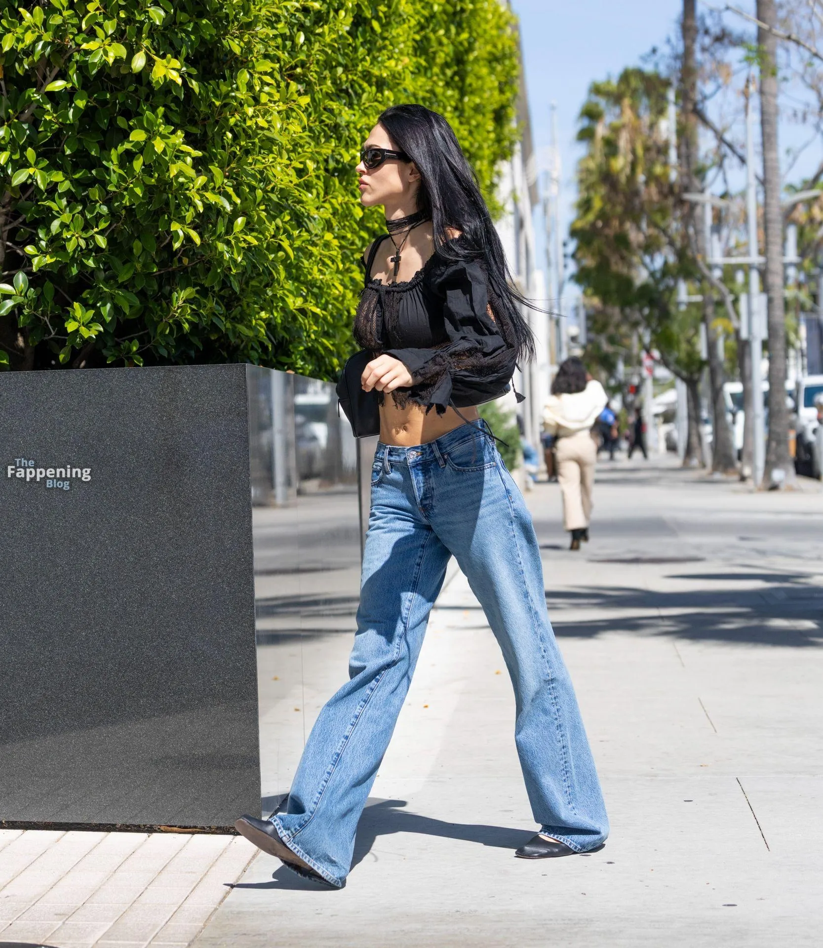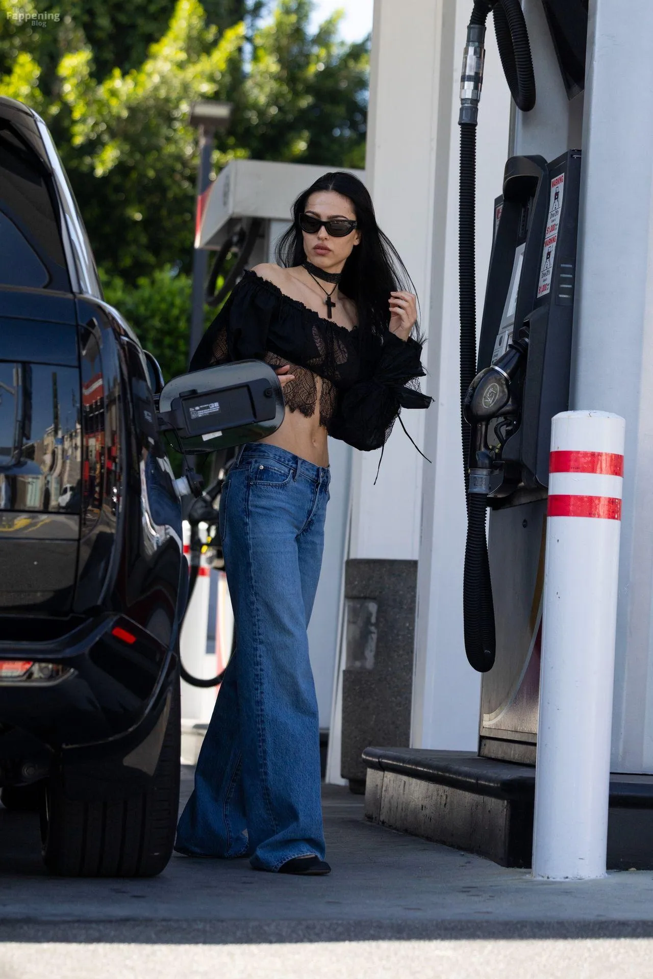 Amelia Gray Hamlin stepped out in a sheer lace top, flashing her tits and midriff and pairing it with low-slung denim and a striking cross necklace.
