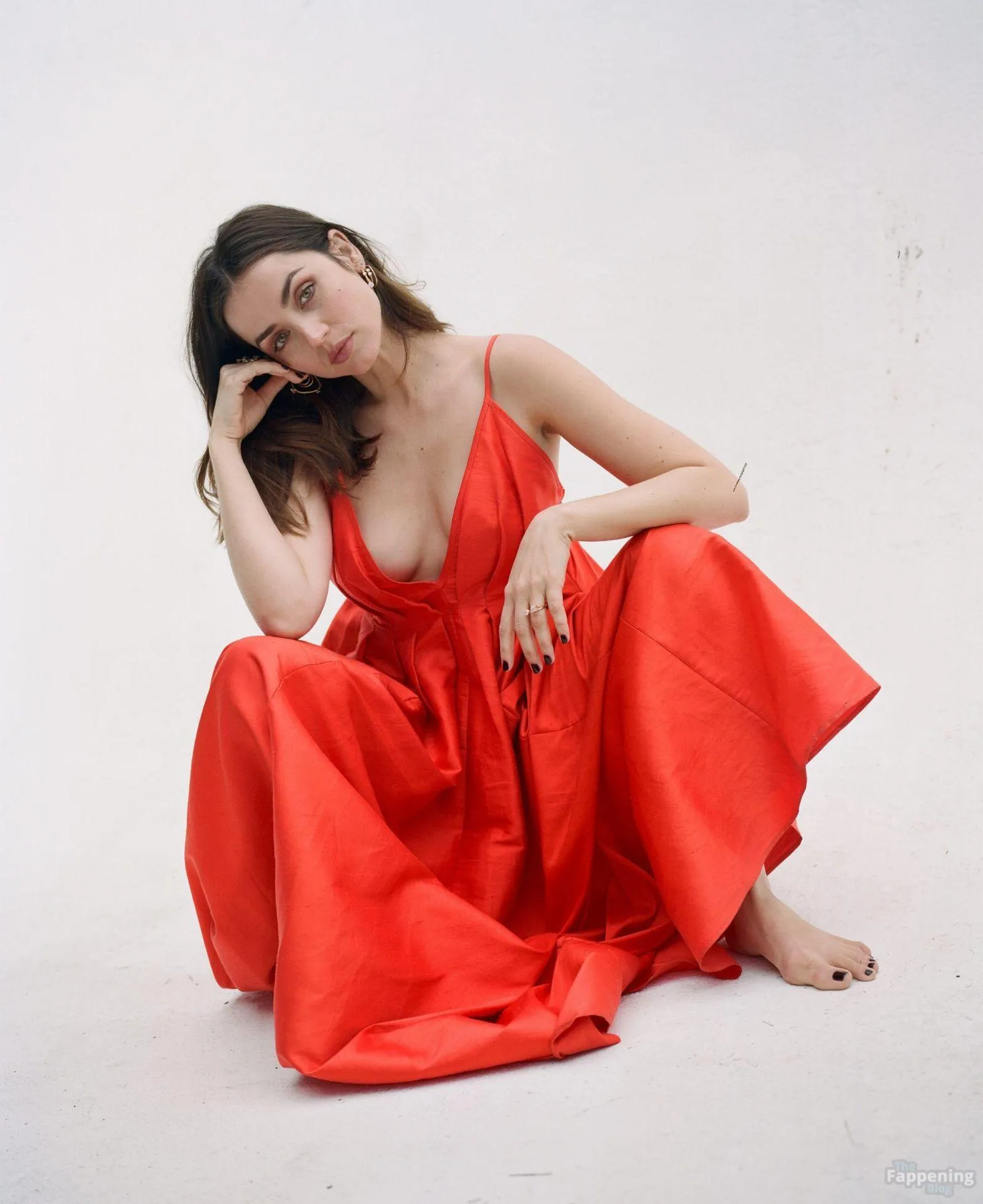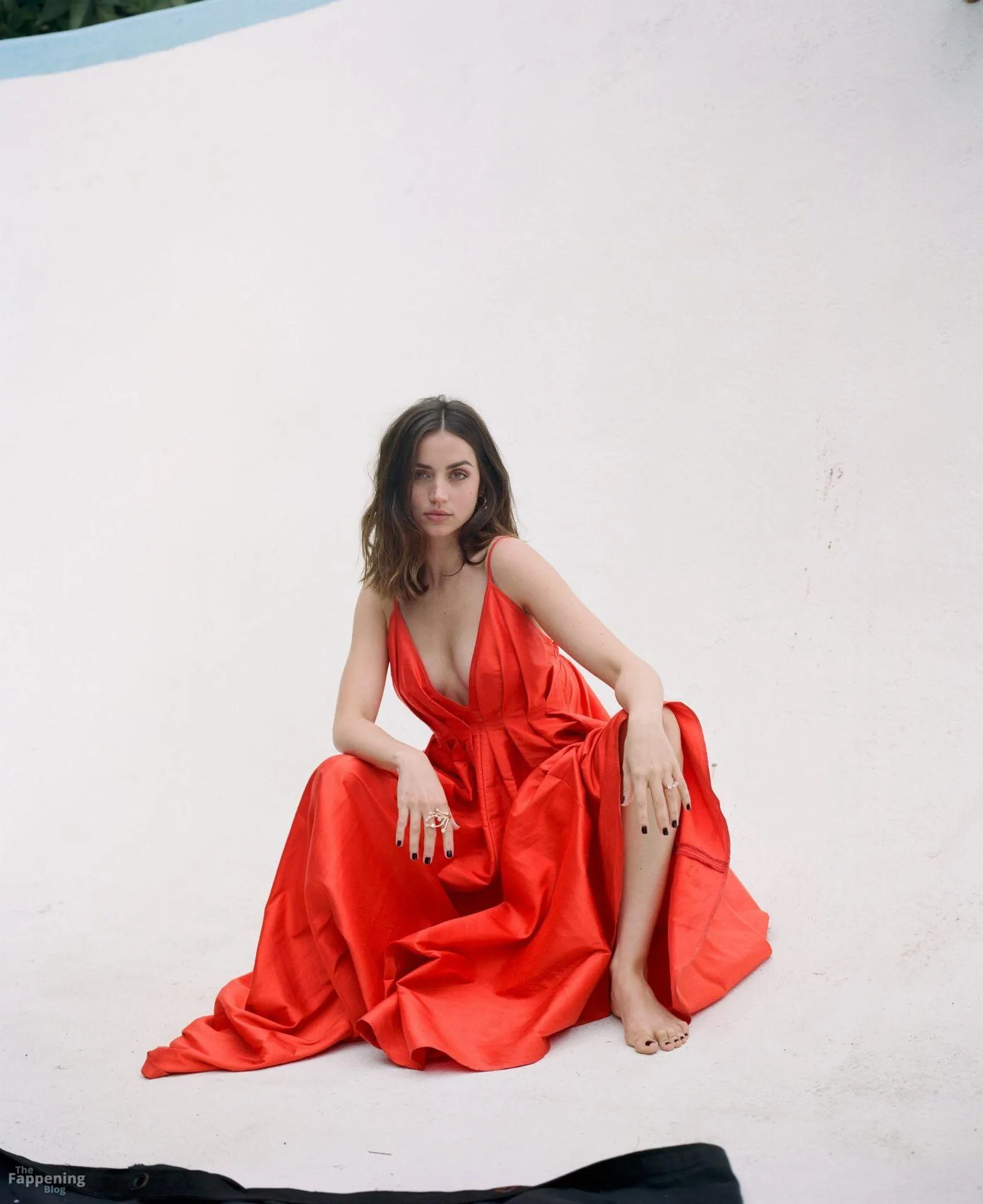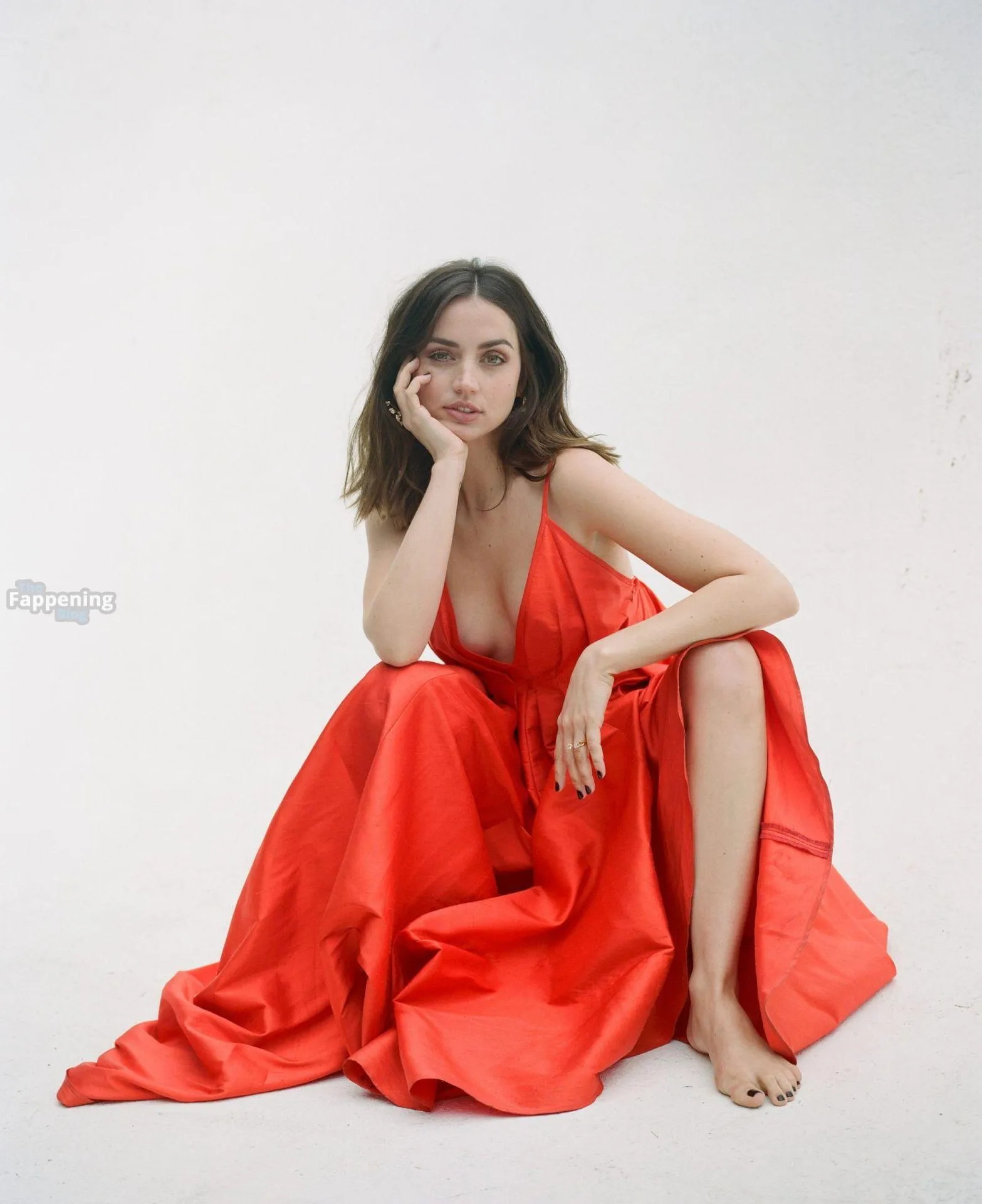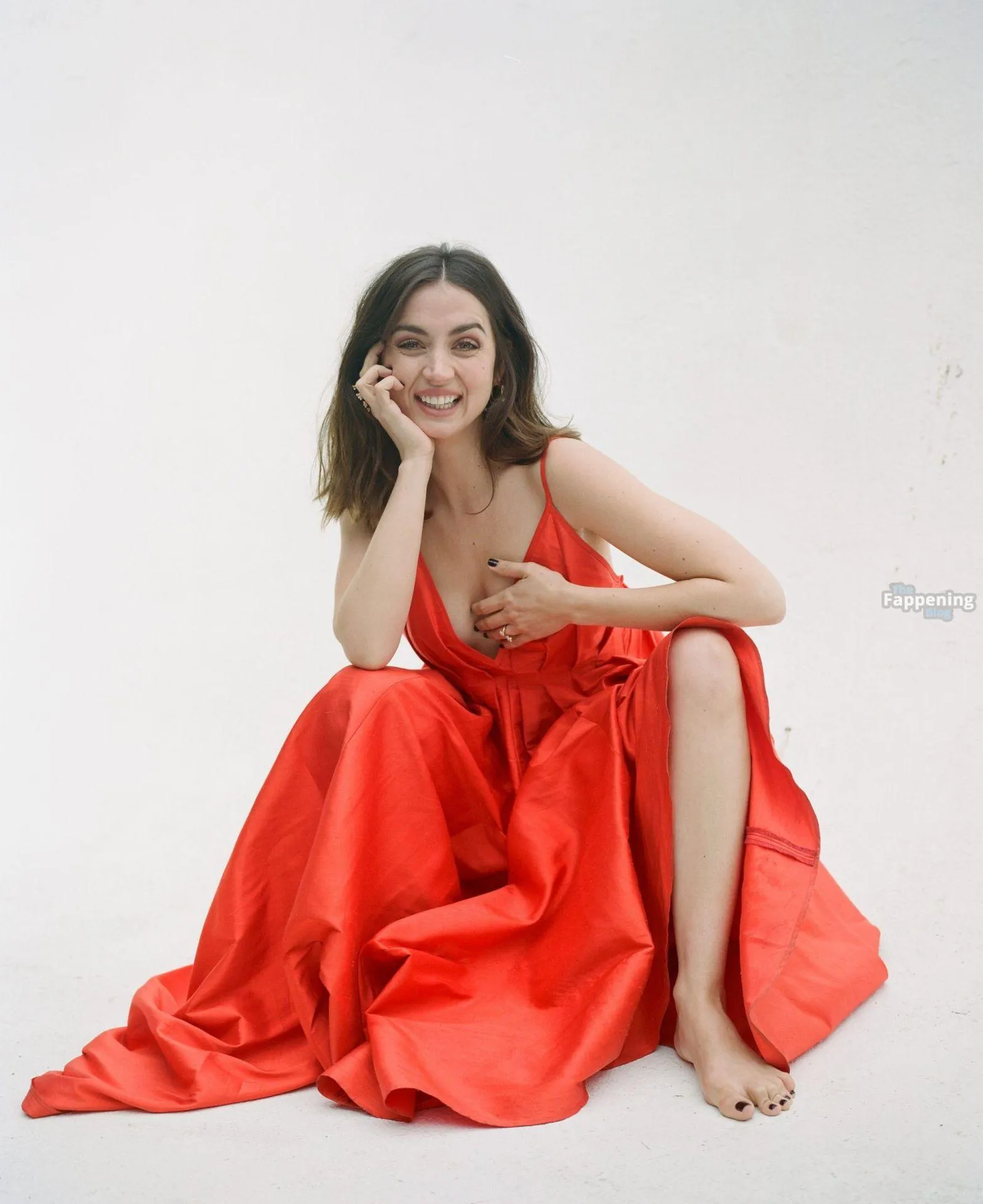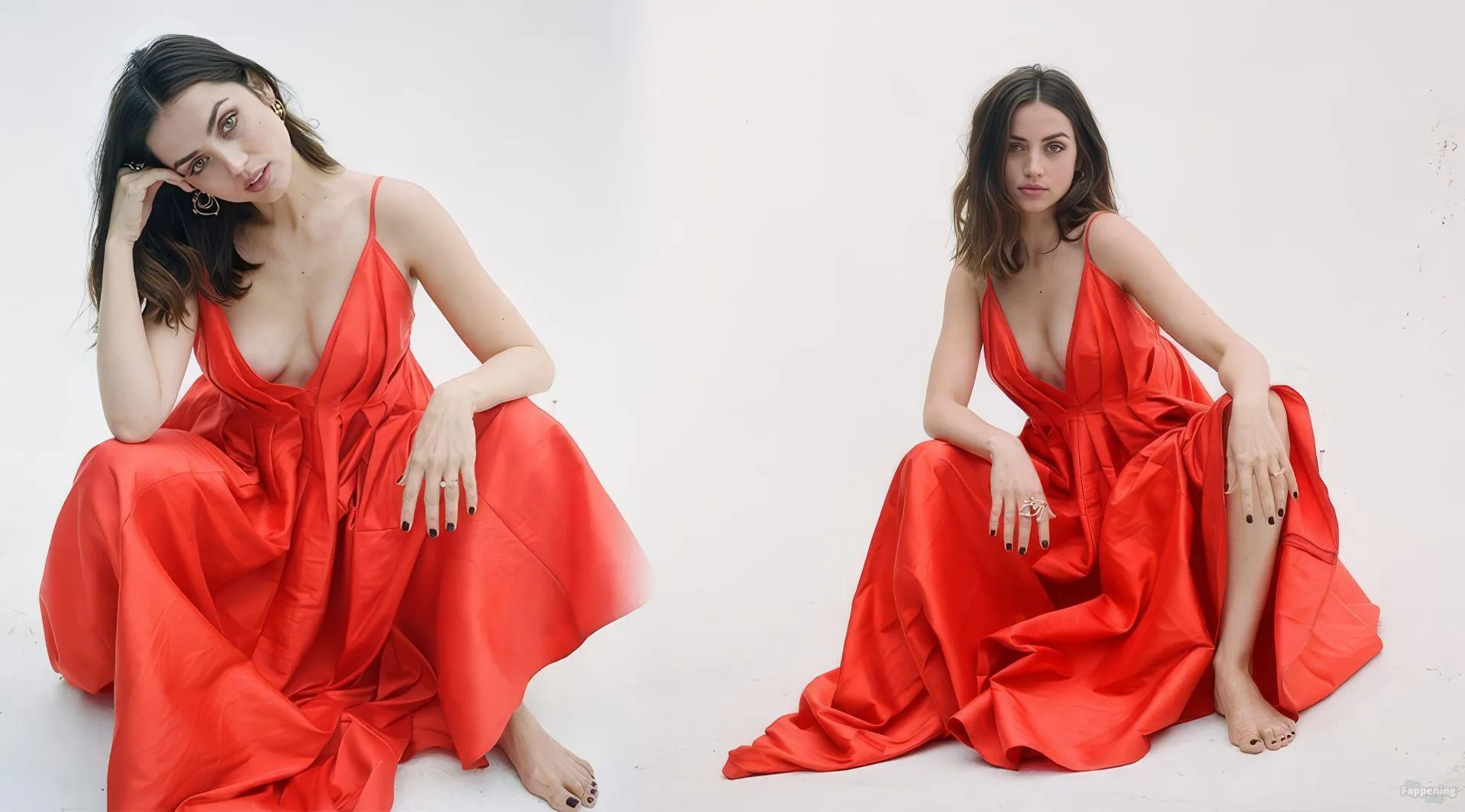 Barefoot and braless Ana de Armas poses in a red dress, showin’ off her sexy cleavage.