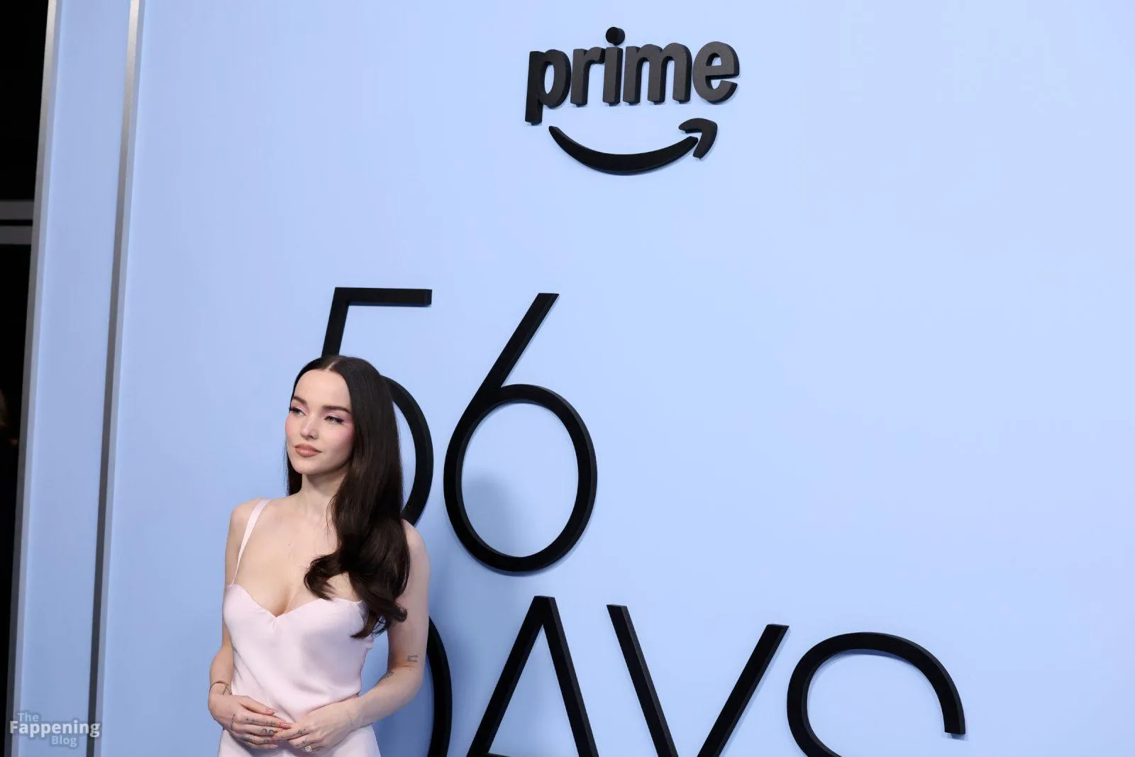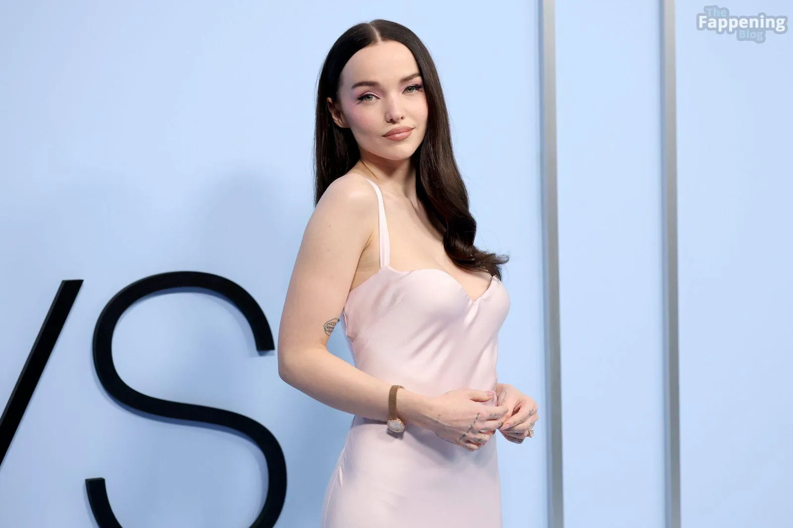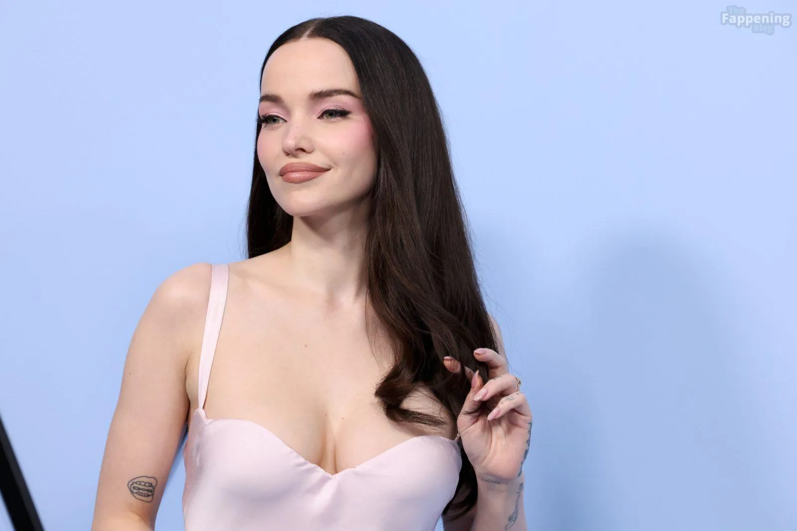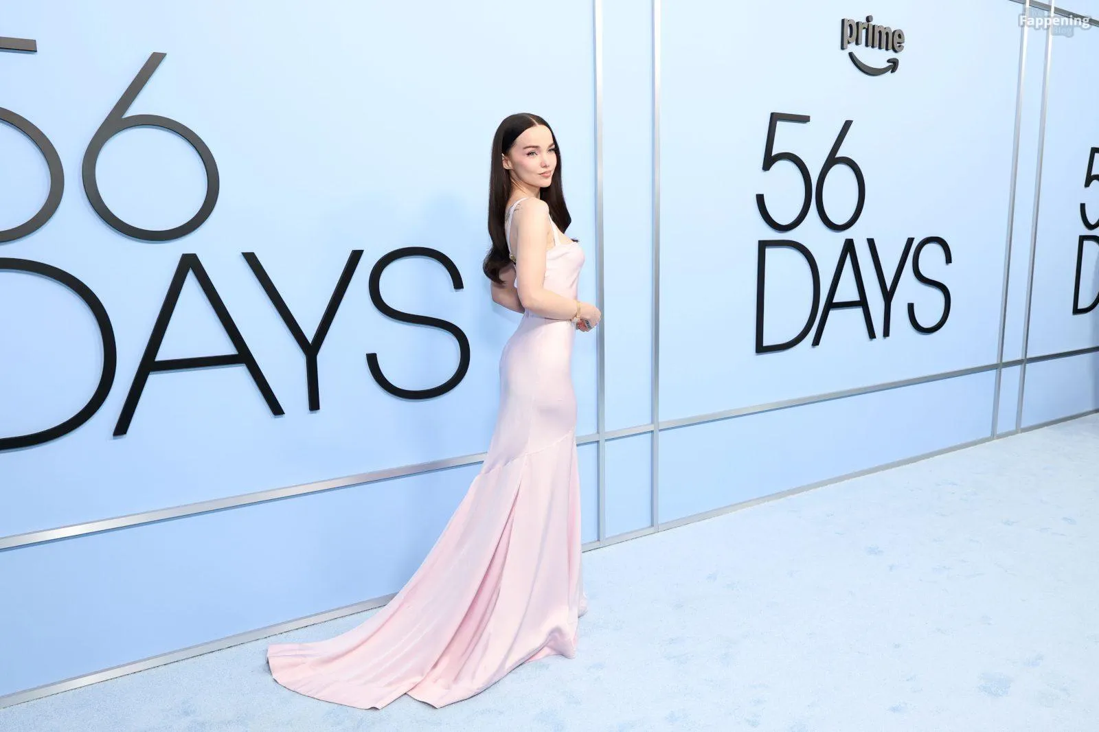 The Fappening Star Dove Cameron stuns with her cleavage, wearin’ a pink Versace gown at the “56 Days” premiere.