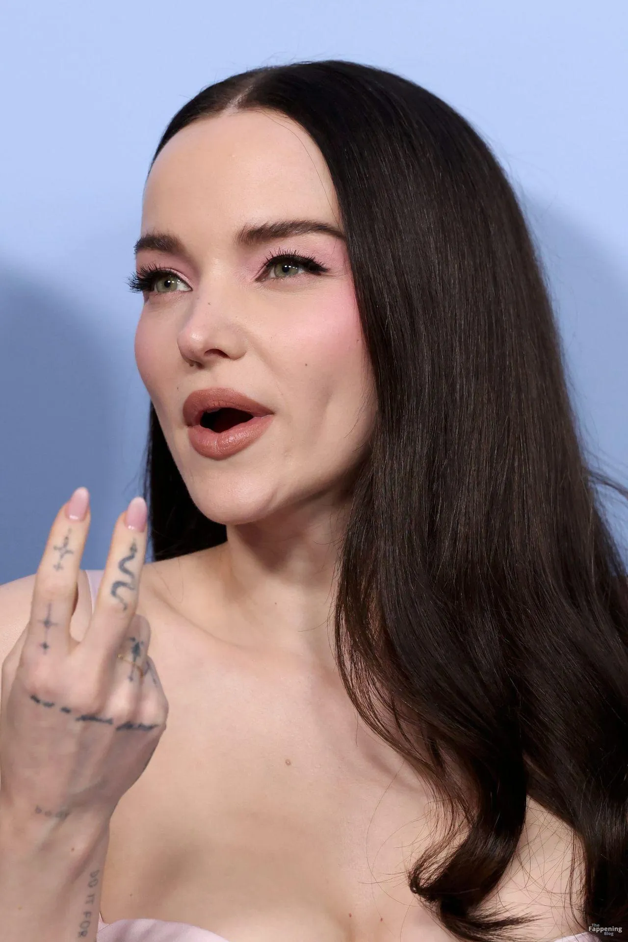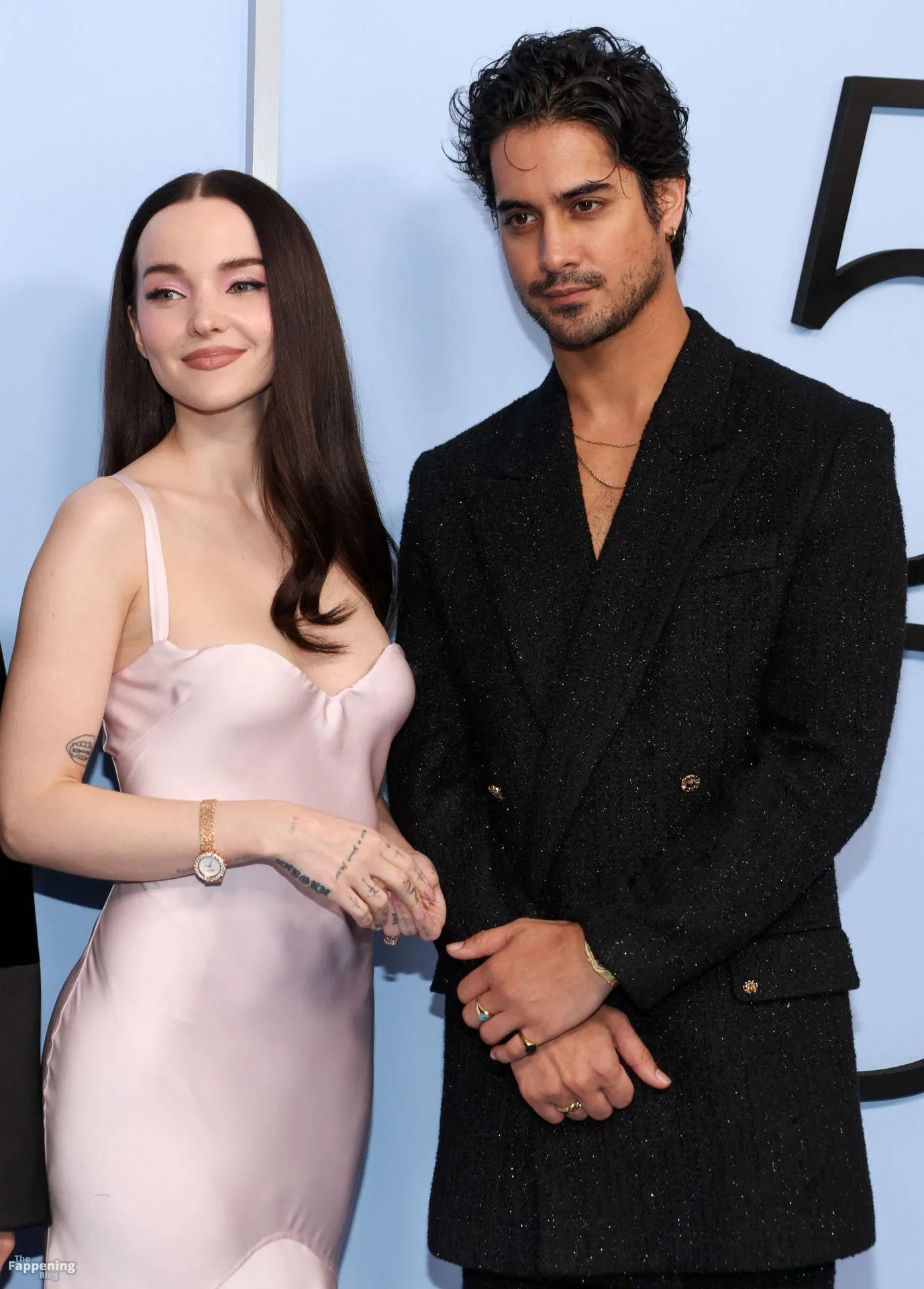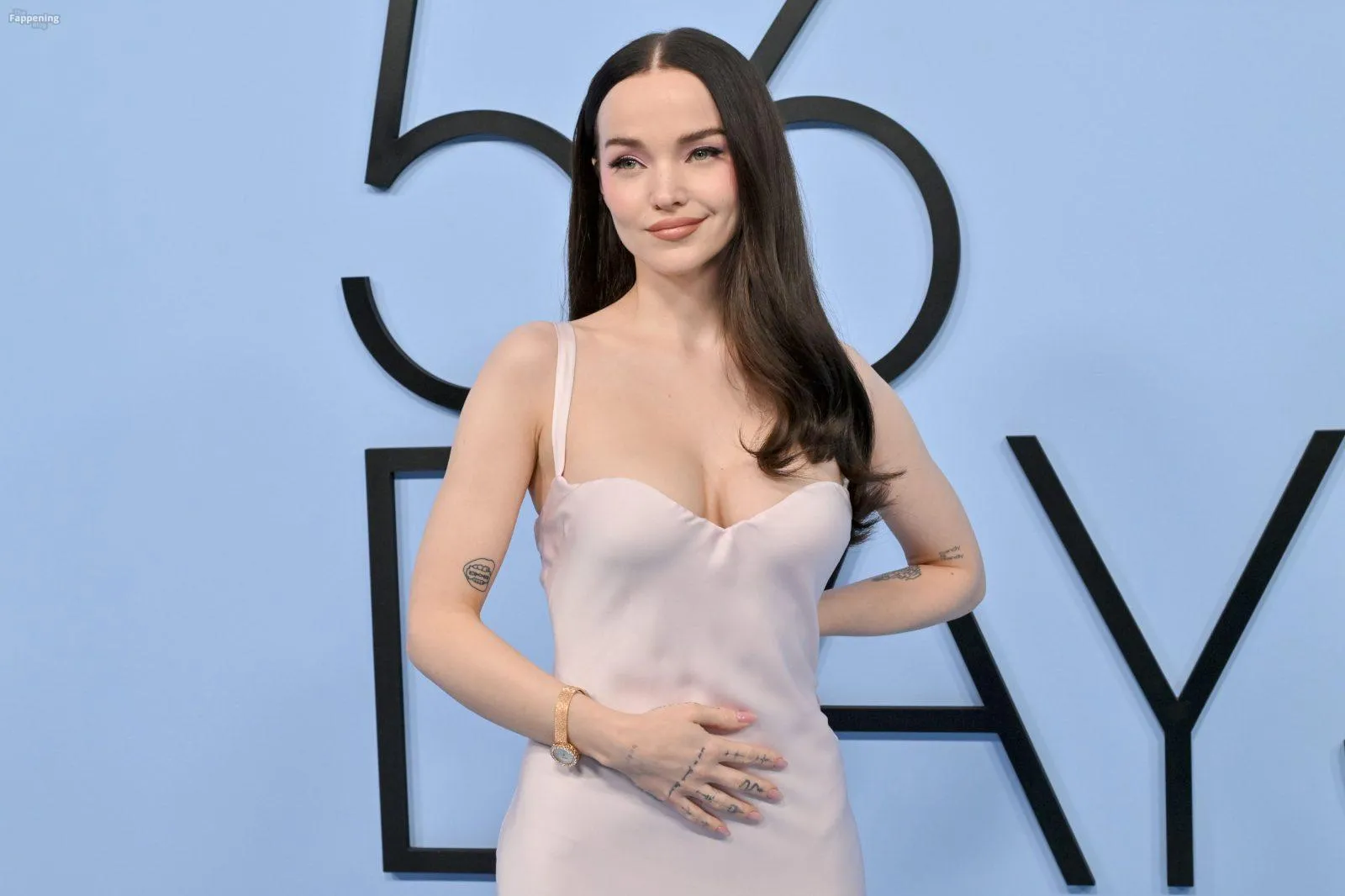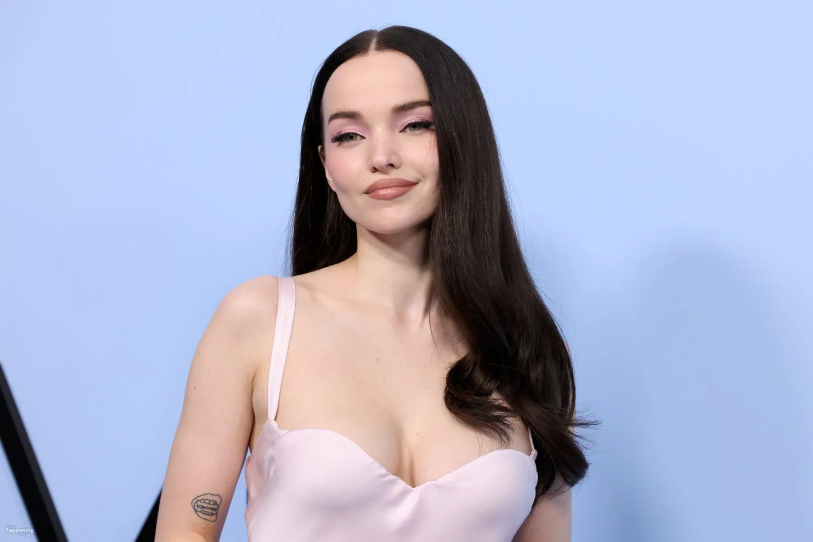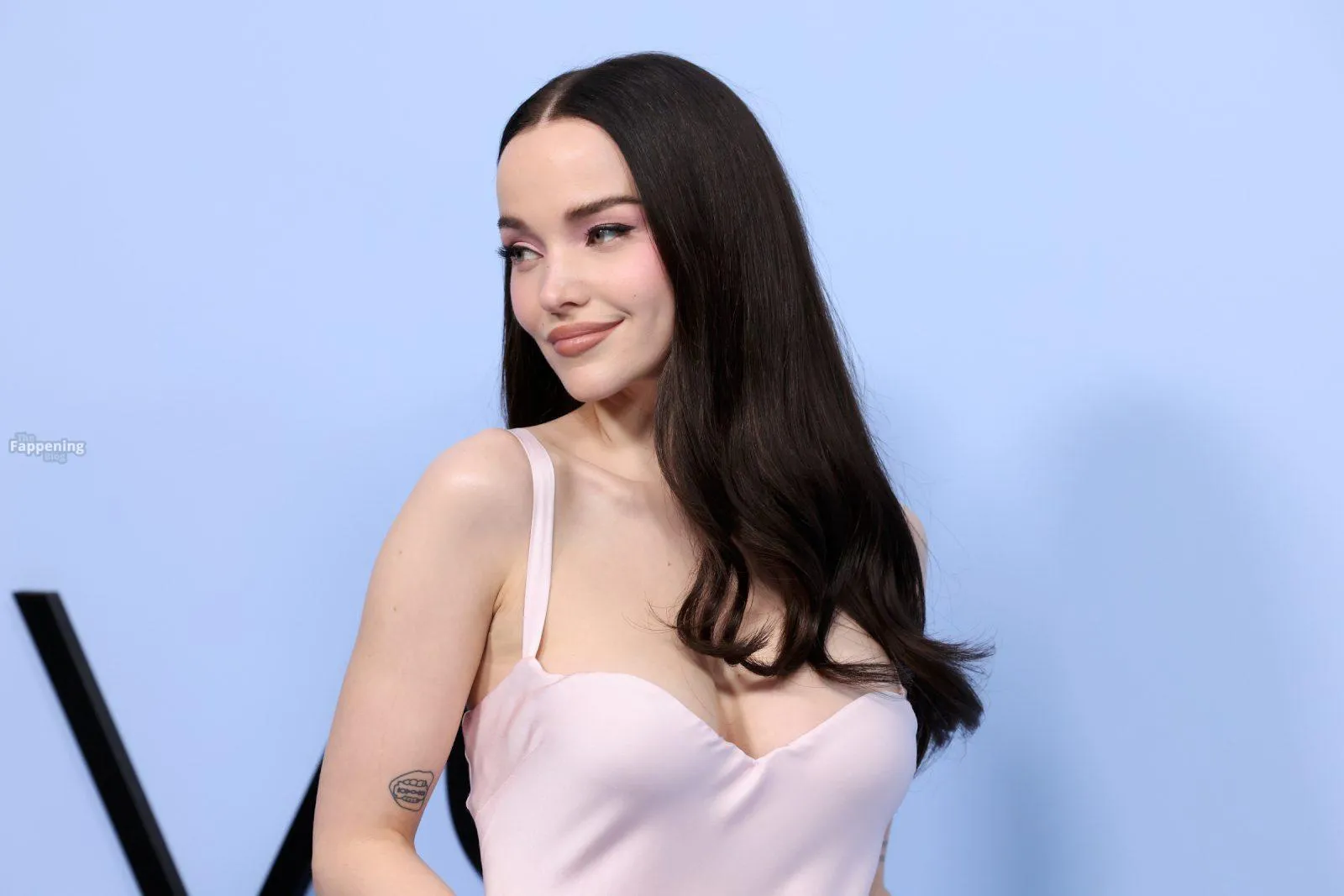 The Fappening Star Dove Cameron stuns with her cleavage, wearin’ a pink Versace gown at the “56 Days” premiere.