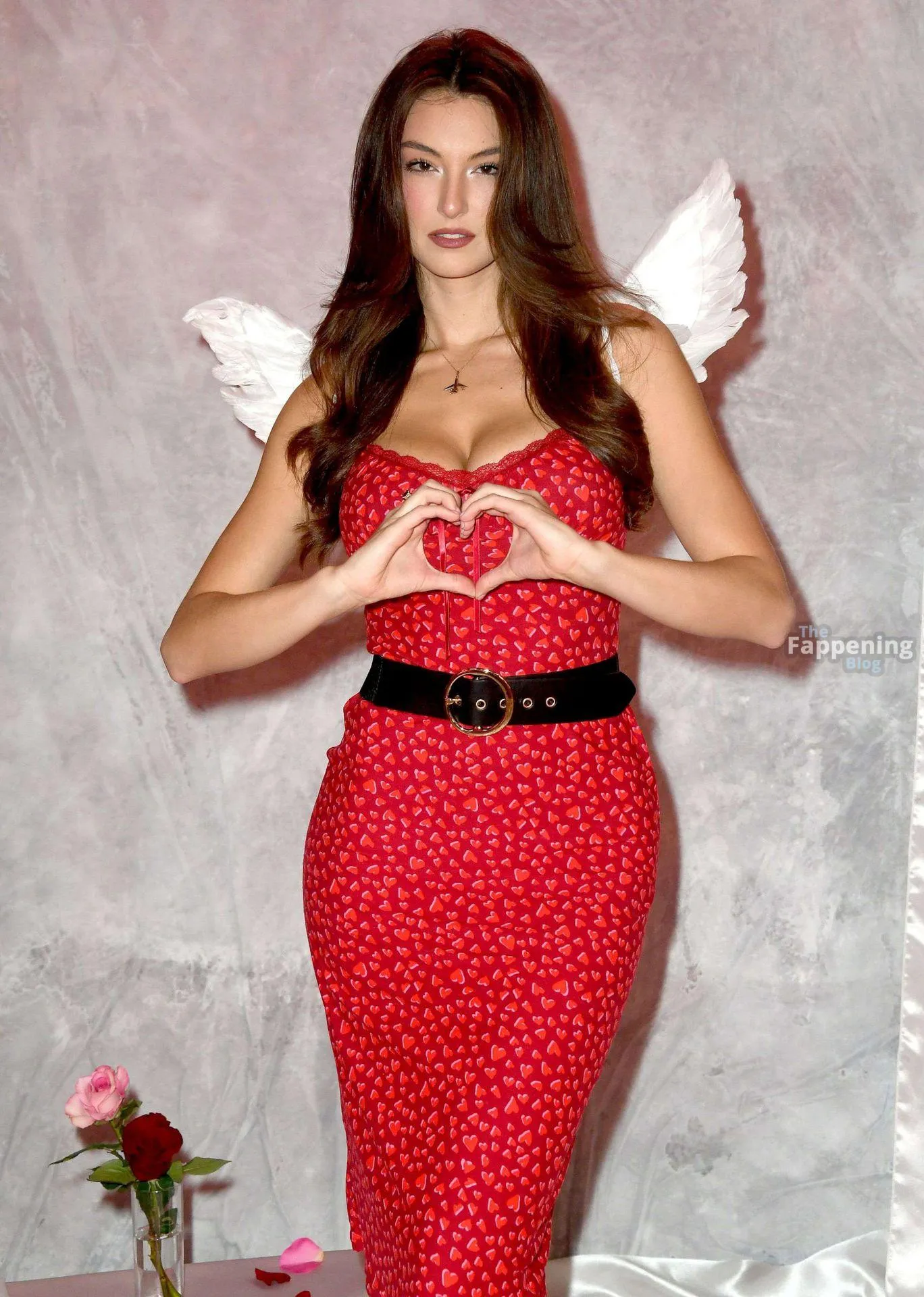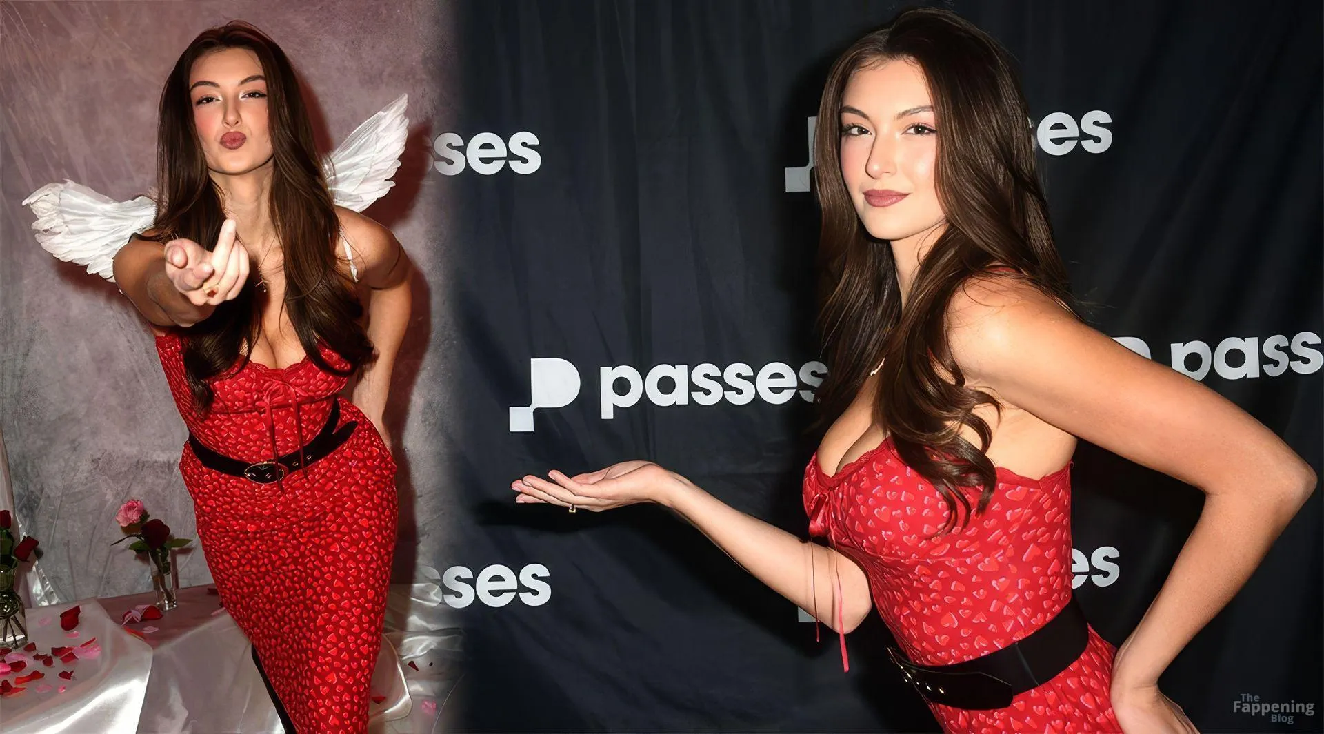 Rachel Pizzolato is pictured in a red heart mini dress and thigh-high boots for her new Valentine’s shoot at Passes.